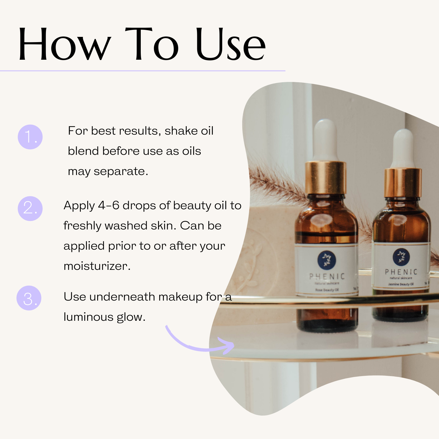 Our soothing Rose Beauty Oil blend harnesses the scent and benefits of rose essential oil to promote even skin tone and protect against blemishes. Use daily with a moisturizer or on its own for clear glowing skin.